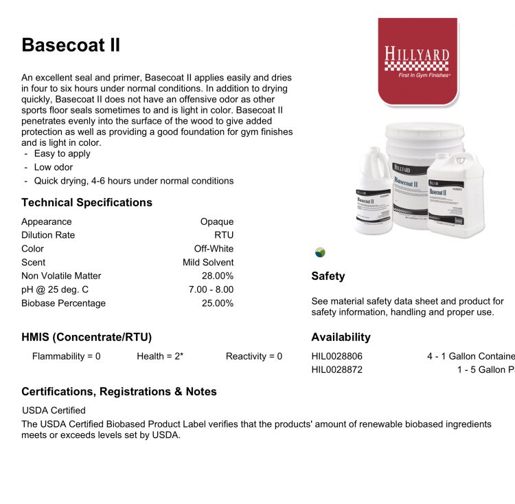 An excellent seal and primer, Basecoat II applies easily and dries in four to six hours under normal conditions. In addition to drying quickly, Basecoat II does not have an offensive odor as other sports floor seals sometimes to and is light in color. Basecoat II penetrates evenly into the surface of the wood to give added protection as well as providing a good foundation for gym finishes and is light in color.