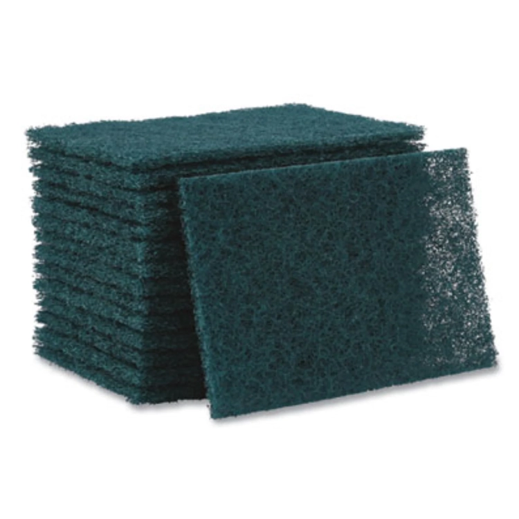 Clean floors, equipment, and counters with these Boardwalk BWK186 scouring pads. The 6 x 9-inch pads cover a large surface area with each swipe, and the distinct green hue fits into a color-coded cleaning supply system. Rely on these thick, HACCP-certified scrubbing pads to efficiently remove caked-on grime and scuff marks. These heavy duty Boardwalk BWK186 scouring pads are made of a durable resin and mineral fiber material for reliable cohesion during intense scrubbing.