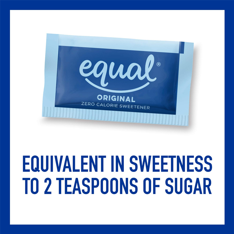 The Equal Original 0 Calorie Sweetener will add great taste to tea, coffee, and various other beverages. This calorie-free sugar substitute dissolves quickly in both hot and cold beverages. Every single-serve packet is equivalent in sweetness to two teaspoons of sugar. Available in convenient blue packets, this Equal original sweetener bulk pack is ideal for cafes, cafeterias, and office pantries.