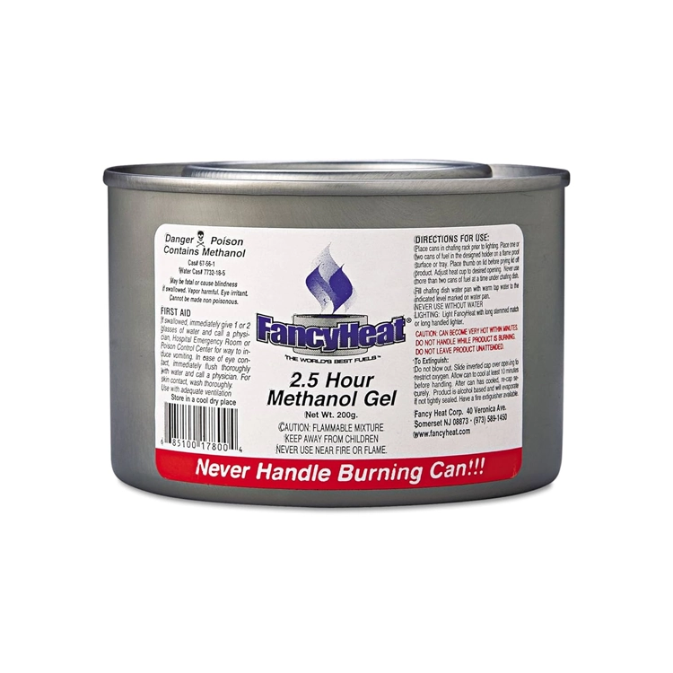 FancyHeat Premium Methanol based gel provides you with the longest burning and most economic fuel in the world. Our formula burns up to 20% longer than any of our competitors. Ideal for beverage urns, hot boxes, chafing dishes, or camping. Keeps food hot and in the safe serving zone and is safe for indoor and outdoor events.